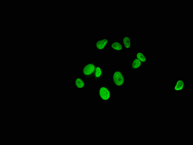 Immunofluorescence staining of MCF-7 cells with CSB-PA010378PA186me1HU at 1:5, counter-stained with DAPI. The cells were fixed in 4% formaldehyde, permeabilized using 0.2% Triton X-100 and blocked in 10% normal Goat Serum. The cells were then incubated with the antibody overnight at 4°C. The secondary antibody was Alexa Fluor 488-congugated AffiniPure Goat Anti-Rabbit IgG(H+L).