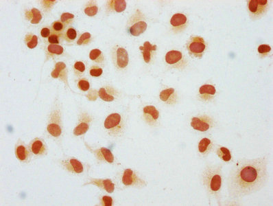 Immunocytochemistry analysis of CSB-PA010378OA45me1HU diluted at 1:25 and staining in Hela cells performed on a Leica BondTM system. The cells were fixed in 4% formaldehyde, permeabilized using 0.2% Triton X-100 and blocked with 10% normal goat serum 30min at RT. Then primary antibody (1% BSA) was incubated at 4°C overnight. The primary is detected by a biotinylated secondary antibody and visualized using an HRP conjugated SP system.