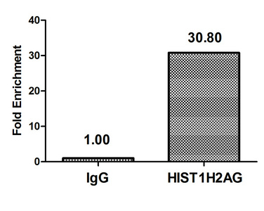 Chromatin Immunoprecipitation Hela (4*106) were treated with Micrococcal Nuclease, sonicated, and immunoprecipitated with 5µg anti-HIST1H2AG (CSB-PA010389OA09me1HU) or a control normal rabbit IgG. The resulting ChIP DNA was quantified using real-time PCR with primers against the β-Globin promoter.