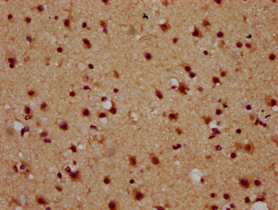 IHC image of CSB-PA015445LA01HU diluted at 1:600 and staining in paraffin-embedded human brain tissue performed on a Leica BondTM system. After dewaxing and hydration, antigen retrieval was mediated by high pressure in a citrate buffer (pH 6.0). Section was blocked with 10% normal goat serum 30min at RT. Then primary antibody (1% BSA) was incubated at 4°C overnight. The primary is detected by a biotinylated secondary antibody and visualized using an HRP conjugated SP system.