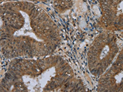 The image on the left is immunohistochemistry of paraffin-embedded Human colon cancer tissue using CSB-PA088333(NAT10 Antibody) at dilution 1/40, on the right is treated with fusion protein. (Original magnification: ×200)