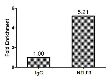 • Chromatin Immunoprecipitation Hela (1.1*106) were cross-linked with formaldehyde, sonicated, and immunoprecipitated with 4µg anti-NELFB or a control normal rabbit IgG. The resulting ChIP DNA was quantified using real-time PCR with primers (CSB-PP03765HU) against the TFF1 promoter.