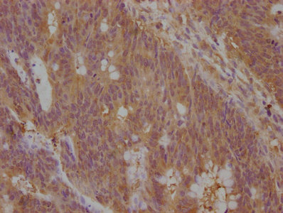 • IHC image of CSB-PA892354NA01HU diluted at 1:100 and staining in paraffin-embedded human colon cancer performed on a Leica BondTM system. After dewaxing and hydration, antigen retrieval was mediated by high pressure in a citrate buffer (pH 6.0). Section was blocked with 10% normal goat serum 30min at RT. Then primary antibody (1% BSA) was incubated at 4°C overnight. The primary is detected by a biotinylated secondary antibody and visualized using an HRP conjugated SP system.