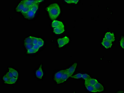 Immunofluorescence staining of PC-3 cells with CSB-PA850809LA01HU at 1:50, counter-stained with DAPI. The cells were fixed in 4% formaldehyde, permeabilized using 0.2% Triton X-100 and blocked in 10% normal Goat Serum. The cells were then incubated with the antibody overnight at 4°C. The secondary antibody was Alexa Fluor 488-congugated AffiniPure Goat Anti-Rabbit IgG(H+L).