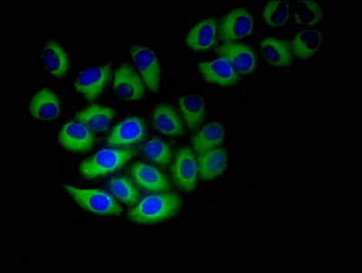 Immunofluorescent analysis of HepG2 cells using CSB-PA856441LA01HU at dilution of 1:100 and Alexa Fluor 488-congugated AffiniPure Goat Anti-Rabbit IgG(H+L)