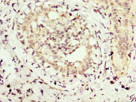 IHC image of CSB-PA015900LA01HU diluted at 1:300 and staining in paraffin-embedded human breast cancer performed on a Leica BondTM system. After dewaxing and hydration, antigen retrieval was mediated by high pressure in a citrate buffer (pH 6.0). Section was blocked with 10% normal goat serum 30min at RT. Then primary antibody (1% BSA) was incubated at 4°C overnight. The primary is detected by a biotinylated secondary antibody and visualized using an HRP conjugated SP system.