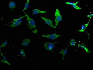 Immunofluorescence staining of U251 cells with CSB-PA015983OA01HU at 1:50, counter-stained with DAPI. The cells were fixed in 4% formaldehyde, permeabilized using 0.2% Triton X-100 and blocked in 10% normal Goat Serum. The cells were then incubated with the antibody overnight at 4°C. The secondary antibody was Alexa Fluor 488-congugated AffiniPure Goat Anti-Rabbit IgG(H+L).