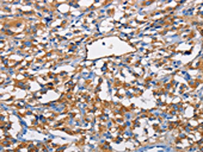 The image on the left is immunohistochemistry of paraffin-embedded Human thyroid cancer tissue using CSB-PA564996(NT5E Antibody) at dilution 1/40, on the right is treated with fusion protein. (Original magnification: ×200)