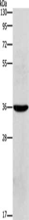 • Gel: 10%SDS-PAGE, Lysate: 40 μg, Lane: Human placenta tissue, Primary antibody: CSB-PA280628(OLR1 Antibody) at dilution 1/450, Secondary antibody: Goat anti rabbit IgG at 1/8000 dilution, Exposure time: 20 seconds
