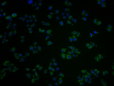 Immunofluorescence staining of Hela cells with CSB-PA884445NA01HU at 1:100, counter-stained with DAPI. The cells were fixed in 4% formaldehyde and blocked in 10% normal Goat Serum. The cells were then incubated with the antibody overnight at 4°C. The secondary antibody was Alexa Fluor 488-congugated AffiniPure Goat Anti-Rabbit IgG(H+L).