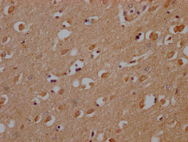 IHC image of CSB-PA884445NA01HU diluted at 1:200 and staining in paraffin-embedded human brain tissue performed on a Leica BondTM system. After dewaxing and hydration, antigen retrieval was mediated by high pressure in a citrate buffer (pH 6.0). Section was blocked with 10% normal goat serum 30min at RT. Then primary antibody (1% BSA) was incubated at 4°C overnight. The primary is detected by a Goat anti-rabbit polymer IgG labeled by HRP and visualized using 0.05% DAB.