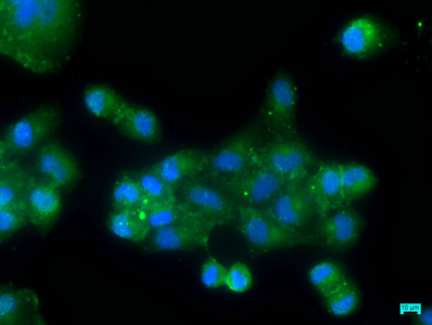 Immunofluorescence staining of Hela cells with CSB-PA861186LA01HU at 1:50, counter-stained with DAPI. The cells were fixed in 4% formaldehyde, permeabilized using 0.2% Triton X-100 and blocked in 10% normal Goat Serum. The cells were then incubated with the antibody overnight at 4°C. The secondary antibody was Alexa Fluor 488-congugated AffiniPure Goat Anti-Rabbit IgG(H+L).