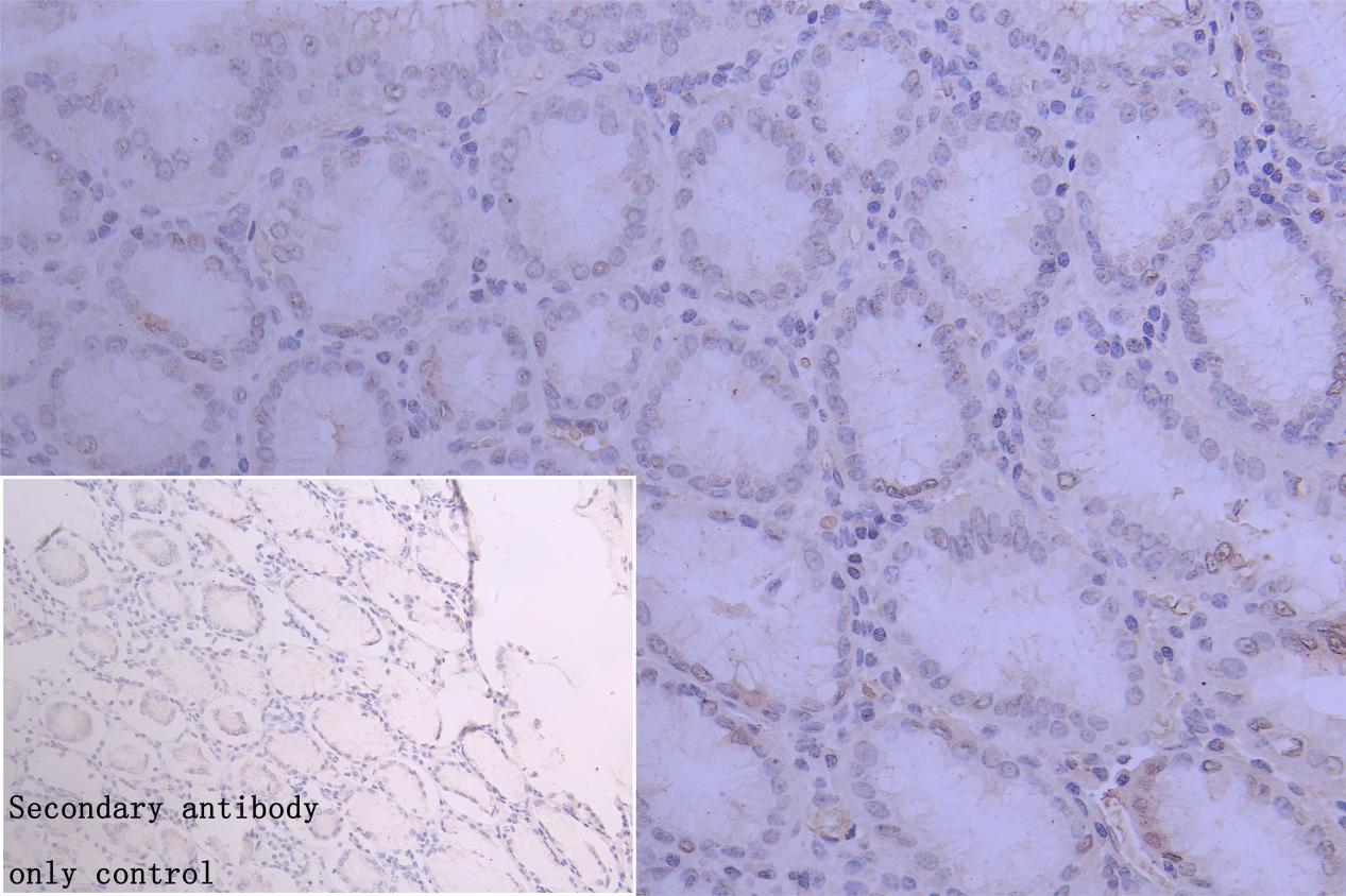 IHC image of CSB-PA017303LA01HU diluted at 1:50 and staining in paraffin-embedded human stomach tissue performed on a Leica BondTM system. After dewaxing and hydration, antigen retrieval was mediated by high pressure in a citrate buffer (pH 6.0). Section was blocked with 10% normal goat serum 30min at RT. Then primary antibody (1% BSA) was incubated at 4°C overnight. The primary is detected by a Goat anti-rabbit polymer IgG labeled by HRP and visualized using 0.05% DAB. Secondary antibody only control: uses 1% BSA instead of primary antibody