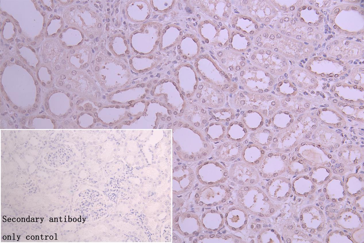 IHC image of CSB-PA017303LA01HU diluted at 1:50 and staining in paraffin-embedded human kidney tissue performed on a Leica BondTM system. After dewaxing and hydration, antigen retrieval was mediated by high pressure in a citrate buffer (pH 6.0). Section was blocked with 10% normal goat serum 30min at RT. Then primary antibody (1% BSA) was incubated at 4°C overnight. The primary is detected by a Goat anti-rabbit polymer IgG labeled by HRP and visualized using 0.05% DAB. Secondary antibody only control: uses 1% BSA instead of primary antibody