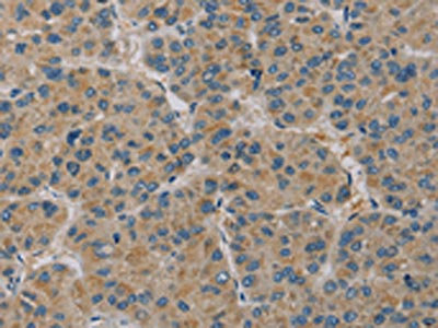 The image on the left is immunohistochemistry of paraffin-embedded Human liver cancer tissue using CSB-PA278505(PAGE2 Antibody) at dilution 1/20, on the right is treated with fusion protein. (Original magnification: ×200)