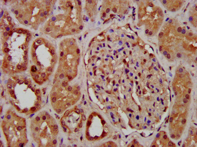 IHC image of CSB-PA863114LA01HU diluted at 1:400 and staining in paraffin-embedded human kidney tissue performed on a Leica BondTM system. After dewaxing and hydration, antigen retrieval was mediated by high pressure in a citrate buffer (pH 6.0). Section was blocked with 10% normal goat serum 30min at RT. Then primary antibody (1% BSA) was incubated at 4°C overnight. The primary is detected by a biotinylated secondary antibody and visualized using an HRP conjugated SP system.
