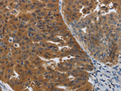 The image on the left is immunohistochemistry of paraffin-embedded Human ovarian cancer tissue using CSB-PA558079(PDCD2 Antibody) at dilution 1/50, on the right is treated with synthetic peptide. (Original magnification: ×200)