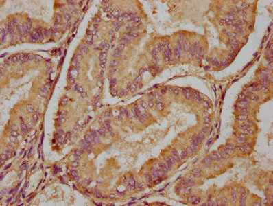 • IHC image of CSB-PA617840LA01HU diluted at 1:100 and staining in paraffin-embedded human endometrial cancer performed on a Leica BondTM system. After dewaxing and hydration, antigen retrieval was mediated by high pressure in a citrate buffer (pH 6.0). Section was blocked with 10% normal goat serum 30min at RT. Then primary antibody (1% BSA) was incubated at 4°C overnight. The primary is detected by a biotinylated secondary antibody and visualized using an HRP conjugated SP system.