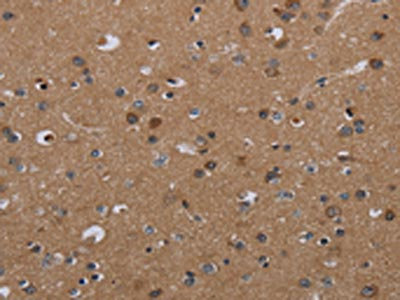 • The image on the left is immunohistochemistry of paraffin-embedded Human brain tissue using CSB-PA108491(PDGFC Antibody) at dilution 1/40, on the right is treated with synthetic peptide. (Original magnification: ×200)