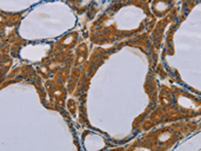 The image on the left is immunohistochemistry of paraffin-embedded Human thyroid cancer tissue using CSB-PA289634(PEF1 Antibody) at dilution 1/20, on the right is treated with fusion protein. (Original magnification: ×200)