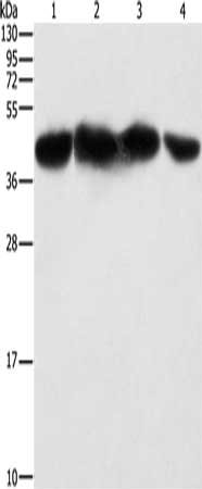 Gel: 10%SDS-PAGE, Lysate: 40 μg, Lane 1-4: HepG2 cells, 293T cells, hela cells, NIH/3T3 cells, Primary antibody: CSB-PA145596(PGK2 Antibody) at dilution 1/600, Secondary antibody: Goat anti rabbit IgG at 1/8000 dilution, Exposure time: 5 seconds