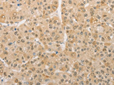 The image on the left is immunohistochemistry of paraffin-embedded Human liver cancer tissue using CSB-PA191316(PGK2 Antibody) at dilution 1/50, on the right is treated with fusion protein. (Original magnification: ×200)