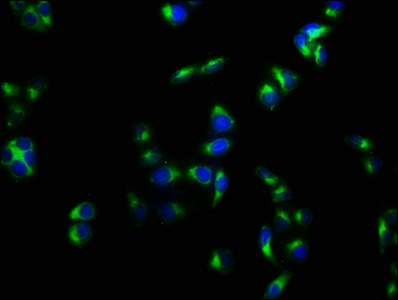 Immunofluorescence staining of Hela cells with CSB-PA07505A0Rb at 1:133, counter-stained with DAPI. The cells were fixed in 4% formaldehyde, permeabilized using 0.2% Triton X-100 and blocked in 10% normal Goat Serum. The cells were then incubated with the antibody overnight at 4°C. The secondary antibody was Alexa Fluor 488-congugated AffiniPure Goat Anti-Rabbit IgG(H+L).