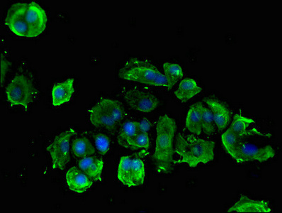 Immunofluorescent analysis of MCF-7 cells using CSB-PA865102LA01HU at dilution of 1:100 and Alexa Fluor 488-congugated AffiniPure Goat Anti-Rabbit IgG(H+L)