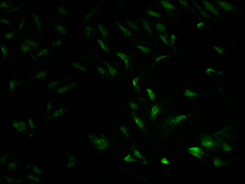 Immunofluorescence staining of Hela cells with CSB-PA030070HA01HU at 1:100, counter-stained with DAPI. The cells were fixed in 4% formaldehyde and blocked in 10% normal Goat Serum. The cells were then incubated with the antibody overnight at 4°C. The secondary antibody was Alexa Fluor 488-congugated AffiniPure Goat Anti-Rabbit IgG(H+L).