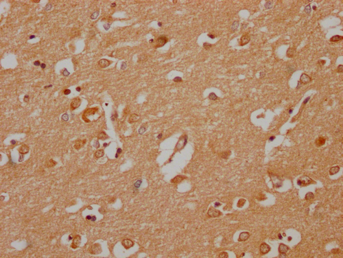 IHC image of CSB-PA030070HA01HU diluted at 1:200 and staining in paraffin-embedded human brain tissue performed on a Leica BondTM system. After dewaxing and hydration, antigen retrieval was mediated by high pressure in a citrate buffer (pH 6.0). Section was blocked with 10% normal goat serum 30min at RT. Then primary antibody (1% BSA) was incubated at 4°C overnight. The primary is detected by a Goat anti-rabbit polymer IgG labeled by HRP and visualized using 0.05% DAB.