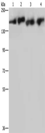 • Gel: 6%SDS-PAGE, Lysate: 40 μg, Lane 1-4: PC3 cells, A431 cells, mouse lung tissue, Hela cells, Primary antibody: CSB-PA697082(PLCB3 Antibody) at dilution 1/200, Secondary antibody: Goat anti rabbit IgG at 1/8000 dilution, Exposure time: 3 minutes