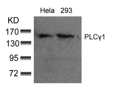 • Western blot analysis of extracts from Hela and 293 cells using PLCg1(Ab-783) Antibody.