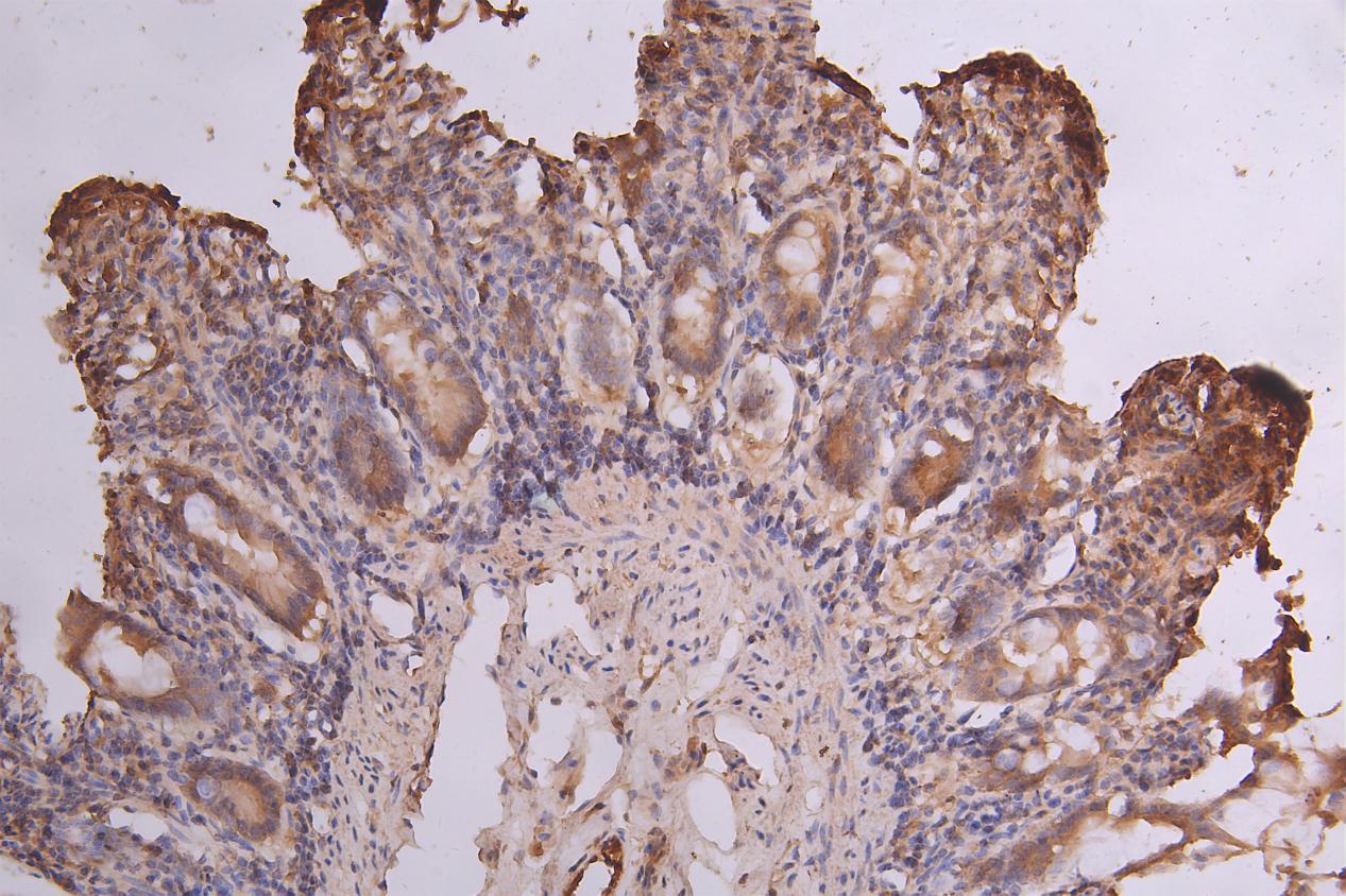 IHC image of CSB-PA716341LA01HU diluted at 1:66 and staining in paraffin-embedded human small intestine tissue performed on a Leica BondTM system. After dewaxing and hydration, antigen retrieval was mediated by high pressure in a citrate buffer (pH 6.0). Section was blocked with 10% normal goat serum 30min at RT. Then primary antibody (1% BSA) was incubated at 4°C overnight. The primary is detected by a Goat anti-rabbit polymer IgG labeled by HRP and visualized using 0.05% DAB.