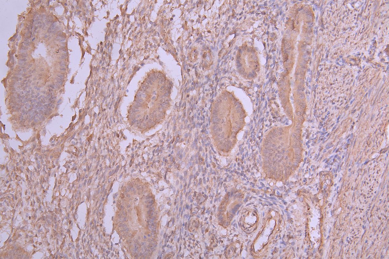 IHC image of CSB-PA716341LA01HU diluted at 1:66 and staining in paraffin-embedded human endometrial cancer performed on a Leica BondTM system. After dewaxing and hydration, antigen retrieval was mediated by high pressure in a citrate buffer (pH 6.0). Section was blocked with 10% normal goat serum 30min at RT. Then primary antibody (1% BSA) was incubated at 4°C overnight. The primary is detected by a Goat anti-rabbit polymer IgG labeled by HRP and visualized using 0.05% DAB.