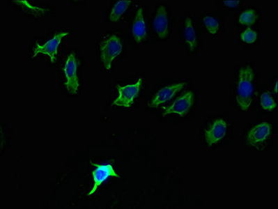 Immunofluorescent analysis of A549 cells using CSB-PA018416LA01HU at dilution of 1:100 and Alexa Fluor 488-congugated AffiniPure Goat Anti-Rabbit IgG(H+L)