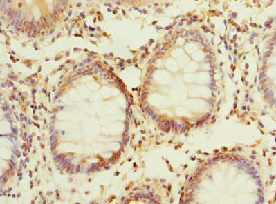 Immunohistochemistry of paraffin-embedded human colon cancer using CSB-PA018416LA01HU at dilution of 1:100