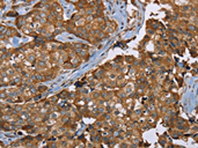 The image on the left is immunohistochemistry of paraffin-embedded Human liver cancer tissue using CSB-PA569970(PLXNB1 Antibody) at dilution 1/50, on the right is treated with synthetic peptide. (Original magnification: ×200)
