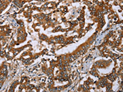 The image on the left is immunohistochemistry of paraffin-embedded Human breast cancer tissue using CSB-PA569970(PLXNB1 Antibody) at dilution 1/50, on the right is treated with synthetic peptide. (Original magnification: ×200)