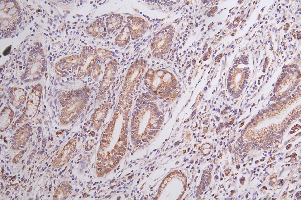 IHC image of CSB-PA018238ESR2HU diluted at 1:50 and staining in paraffin-embedded human gastric cancer performed on a Leica BondTM system. After dewaxing and hydration, antigen retrieval was mediated by high pressure in a citrate buffer (pH 6.0). Section was blocked with 10% normal goat serum 30min at RT. Then primary antibody (1% BSA) was incubated at 4°C overnight. The primary is detected by a Goat anti-rabbit polymer IgG labeled by HRP and visualized using 0.05% DAB.