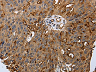 The image on the left is immunohistochemistry of paraffin-embedded Human ovarian cancer tissue using CSB-PA174197(PODXL Antibody) at dilution 1/20, on the right is treated with synthetic peptide. (Original magnification: ×200)