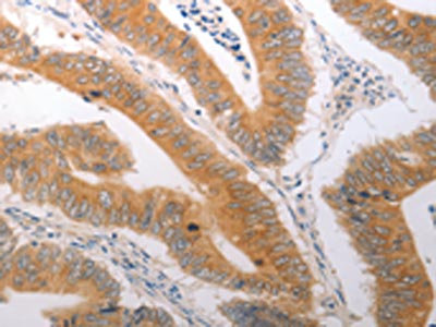 The image on the left is immunohistochemistry of paraffin-embedded Human colon cancer tissue using CSB-PA293075(PPAP2C Antibody) at dilution 1/40, on the right is treated with synthetic peptide. (Original magnification: ×200)