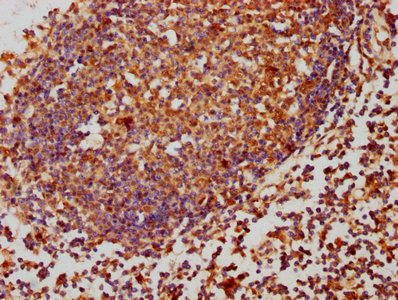 IHC image of CSB-PA00985A0Rb diluted at 1:260 and staining in paraffin-embedded human lymph node tissue performed on a Leica BondTM system. After dewaxing and hydration, antigen retrieval was mediated by high pressure in a citrate buffer (pH 6.0). Section was blocked with 10% normal goat serum 30min at RT. Then primary antibody (1% BSA) was incubated at 4°C overnight. The primary is detected by a biotinylated secondary antibody and visualized using an HRP conjugated SP system.