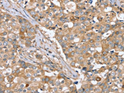 The image on the left is immunohistochemistry of paraffin-embedded Human breast cancer tissue using CSB-PA925621(PPP2R3A Antibody) at dilution 1/40, on the right is treated with synthetic peptide. (Original magnification: ×200)