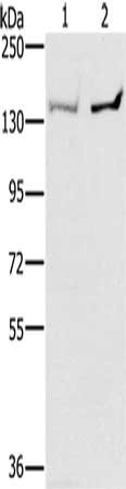 Gel: 6%SDS-PAGE, Lysate: 40 μg, Lane 1-2: 293T cells, PC3 cells, Primary antibody: CSB-PA925621(PPP2R3A Antibody) at dilution 1/400, Secondary antibody: Goat anti rabbit IgG at 1/8000 dilution, Exposure time: 30 seconds