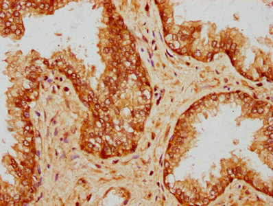 IHC image of CSB-PA018582LA01HU diluted at 1:200 and staining in paraffin-embedded human prostate cancer performed on a Leica BondTM system. After dewaxing and hydration, antigen retrieval was mediated by high pressure in a citrate buffer (pH 6.0). Section was blocked with 10% normal goat serum 30min at RT. Then primary antibody (1% BSA) was incubated at 4°C overnight. The primary is detected by a biotinylated secondary antibody and visualized using an HRP conjugated SP system.