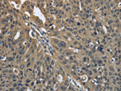 The image on the left is immunohistochemistry of paraffin-embedded Human ovarian cancer tissue using CSB-PA596780(PRDX6 Antibody) at dilution 1/25, on the right is treated with fusion protein. (Original magnification: ×200)