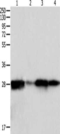 Gel: 12%SDS-PAGE, Lysate: 60 μg, Lane 1-4: Hela cells, mouse intestinum tenue tissue, 293T cells, 231 cells, Primary antibody: CSB-PA596780(PRDX6 Antibody) at dilution 1/300, Secondary antibody: Goat anti rabbit IgG at 1/8000 dilution, Exposure time: 1 second