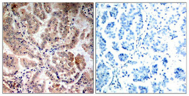 Immunohistochemical analysis of paraffin-embedded human breast carcinoma tissue using AMPKa1/AMPKa2(Ab-174/172) Antibody(left) or the same antibody preincubated with blocking peptide(right).