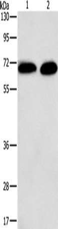 • Gel: 10%SDS-PAGE, Lysate: 40 μg, Lane 1-2: Jurkat cells, NIH/3T3 cells, Primary antibody: CSB-PA937356(PRKCA Antibody) at dilution 1/500, Secondary antibody: Goat anti rabbit IgG at 1/8000 dilution, Exposure time: 1 minute
