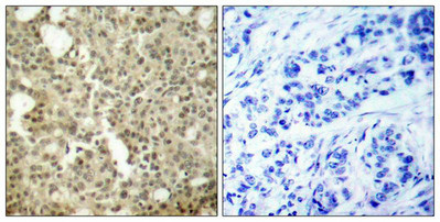Immunohistochemical analysis of paraffin-embedded human breast carcinoma tissue using PKCd(Ab-645) Antibody(left) or the same antibody preincubated with blocking peptide(right).
